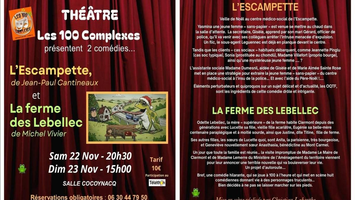 Présentent 2 comédies: L'escampette et la Ferme des Lebellec SAMEDI 22 NOVEMBRE DIMANCHE 23 NOVEMBRE Tarif 10 € Participation Téléthon